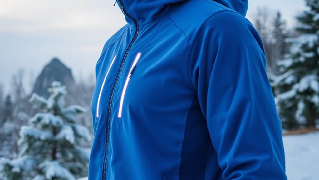 Choosing a heated running jacket with well-designed heating zones guarantees consistent warmth and comfort during cold-weather runs. The number and placement of these zones are vital because they determine how evenly heat is distributed across the jacket. Jackets with multiple zones, like six or more, target key areas such as the back, chest, and arms, providing focused warmth where it’s needed most. Overlapping or strategically positioned zones help prevent cold spots and ensure uniform coverage on the torso and extremities. The ability to control these zones independently adds a layer of customization, allowing me to adjust warmth based on activity level or personal preference. Overall, extensive zone coverage enhances the jacket’s effectiveness in maintaining core temperature during extended cold runs.