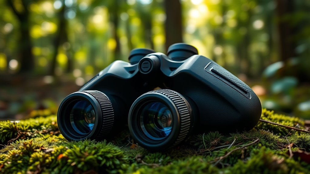 A reliable focusing mechanism is vital for quickly and accurately adjusting your binoculars to different distances, ensuring you never miss a detail during your hunt. High-end models usually feature a central focus wheel that allows for smooth, precise adjustments of both barrels simultaneously, saving you time and effort. Many premium binoculars also include a diopter adjustment on one eyepiece, which corrects for individual vision differences and guarantees sharp images for both eyes. The focusing system should offer a wide range to handle various distances and allow fine-tuning for maximum clarity. Tactile feedback and minimal backlash are essential, especially in tough conditions, helping you focus accurately without frustration. Additionally, tripod adaptability can stabilize your view during long observation periods, reducing fatigue and enhancing detail recognition.