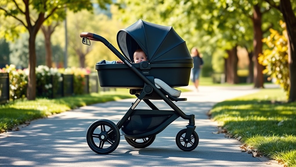 When it comes to uneven or rugged terrains, luxury strollers really shine—they’re built tough enough to handle the bumps and dips. I’ve found that high-end models often feature superior suspension systems and durable wheels, making your ride smooth as silk. Don’t worry about rough patches; these strollers are engineered to perform, turning what could be a rough ride into a comfortable stroll. You’ll feel confident steering any terrain with ease.