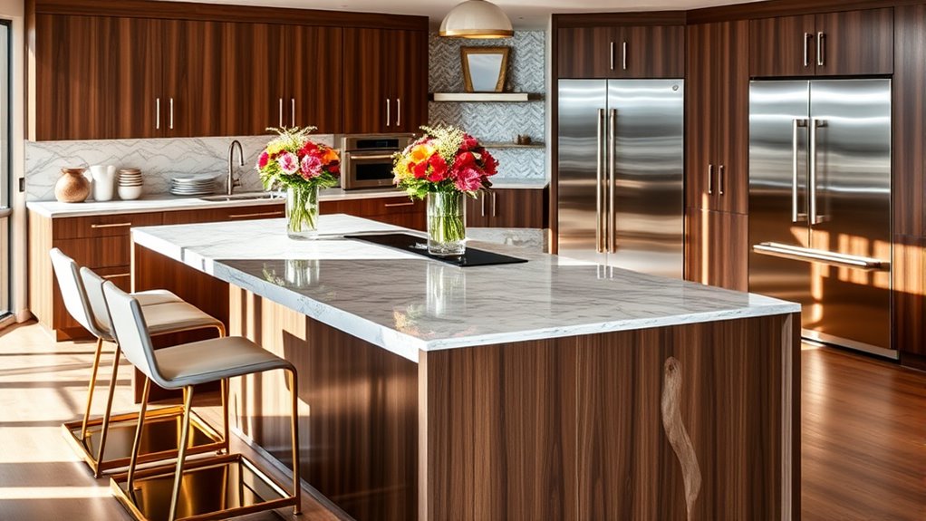 When considering a high-end kitchen island, it’s crucial to weigh mobility and stability options to guarantee it meets your culinary needs. I love islands that feature caster wheels with locking mechanisms; they allow me to reposition the island easily while providing stability during use. Central support wheels or stabilizers help prevent wobbling, ensuring the island remains balanced when stationary. Additionally, adjustable feet or leveling legs are a game-changer for those uneven floors we all encounter. The quality of wheels matters too—rubberized or heavy-duty casters protect my floors and enhance ease of movement. A well-designed kitchen island combines these mobility features and stability options, ensuring it’s both secure and effortless to maneuver, making my cooking experience much more enjoyable.