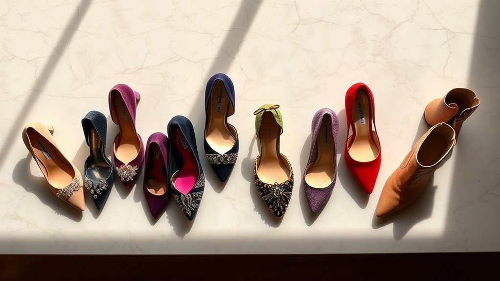 When it comes to selecting high-end women’s shoes, heel height plays a crucial role in my comfort and style preferences. For all-day wear, I often lean towards lower heels, around 1-2 inches, which keep my feet happy and stable. In contrast, when I want to make a statement at a formal event, I’ll opt for heels 3 inches or taller, knowing they’ll elevate my outfit but may require some careful navigation. I always consider the occasion and what I’m wearing; kitten heels and flats work great for the office, while stilettos shine at evening gatherings. Luckily, many high-end brands offer adjustable options, allowing me to blend style and comfort seamlessly, no matter where I go.