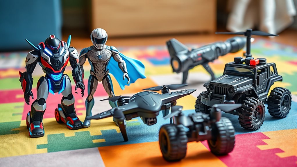 When selecting hot toys for a 7-year-old boy, durability and build quality are vital to guarantee the toy can handle active play and rough handling. I look for toys made from impact-resistant materials like high-quality ABS plastic, which can withstand collisions and rough use. Reinforced joints and sturdy components are essential to prevent breakage during intense play. I also check that fastenings are secure, with minimal small parts that could loosen or detach over time, ensuring safety and longevity. For outdoor or water-based play, water-resistant features are a big plus, protecting the toy from damage and extending its lifespan. Additionally, I pay attention to manufacturer warranties or durability guarantees, which reflect confidence in the toy’s resilience over time.