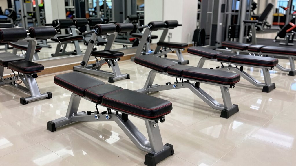 When selecting an incline decline weight bench, space-efficient design features can make a big difference in your workout area. I look for benches with foldable or compact frames that minimize storage needs when not in use. Adjustable components that shift smoothly between incline, decline, and flat positions save space and eliminate the need for extra equipment. Benches with integrated wheels or handles are a game-changer, making repositioning effortless. I also prioritize designs with vertical or multi-angle setups, which maximize workout versatility without taking up extra room. Slim profiles, especially those under 20 inches wide when folded, are ideal for small gyms. These features help me create a flexible, clutter-free workout space that adapts to my needs efficiently.