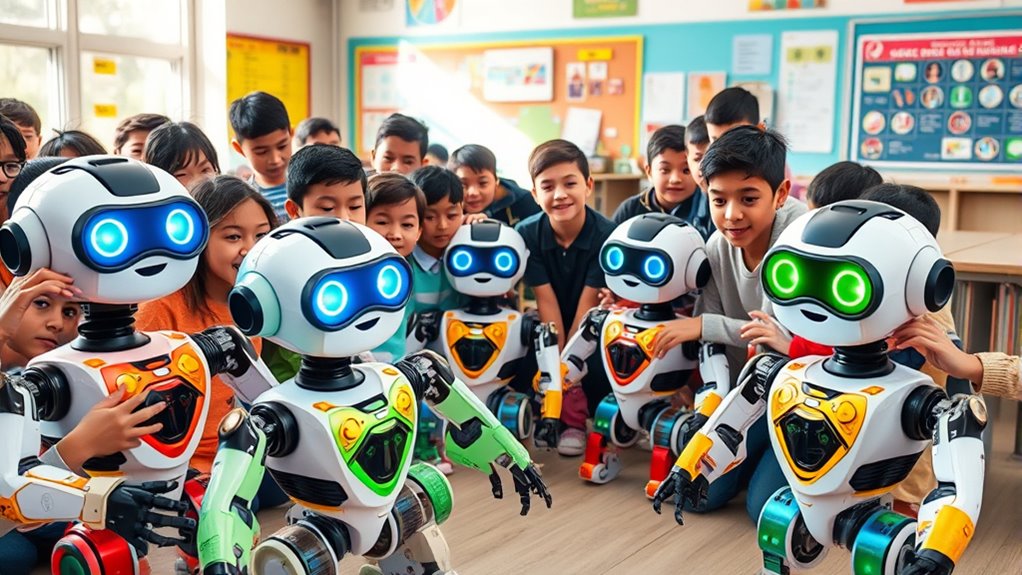 I’ve explored some of the top interactive STEM robots that make learning fun and engaging for kids. These include versatile models with voice, app control, sensors, and expressive features that promote creativity, coding, and problem-solving. They suit different ages from preschoolers to tweens, combining play with educational growth. If you want to discover the best options and what makes each unique, keep going—there’s plenty to explore in this exciting field.
