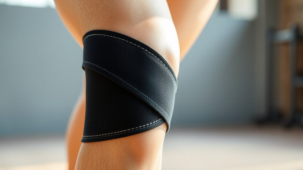 If you have sensitive skin, look for IT-band straps made from soft, hypoallergenic materials like silicone or medical-grade elastic. I always recommend avoiding straps with synthetic dyes or fragrances, as they can cause irritation. Natural fabrics like cotton blends are also gentle options. Choosing a strap with adjustable fit helps reduce chafing and guarantees comfort during activity. Always test a small area first to check for any reactions.