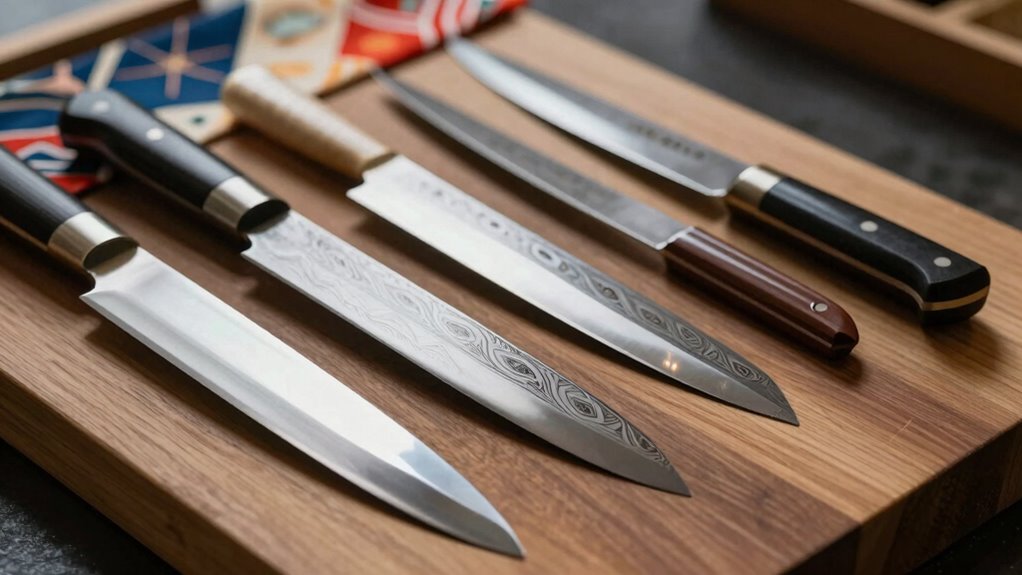 Japanese knife craftsmanship is deeply rooted in centuries-old traditions that emphasize meticulous hand-forging techniques and the use of high-quality steel. I’ve seen firsthand how skilled artisans undergo extensive training to perfect their forging and finishing methods, ensuring each knife is a work of art. Traditional techniques often involve layering steel—like Damascus or layered steels—to boost durability, flexibility, and visual appeal. Patterns such as the water ripple or hammered tsuchime aren’t just decorative; they also help reduce food sticking. Rigorous inspections guarantee that every knife meets high standards for sharpness, balance, and longevity. This unwavering dedication to craftsmanship and tradition ensures that Japanese knives are not only functional tools but also enduring symbols of cultural artistry.