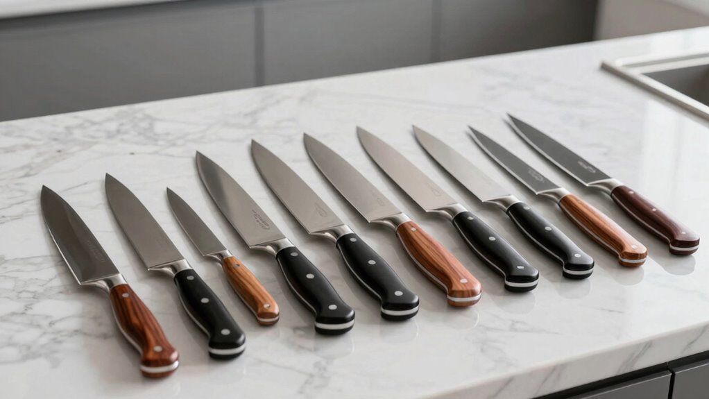 Did you know that many knife sets under $300 can last over five years with proper care? I’ve found that these sets generally offer solid durability and decent edge retention, especially with high-carbon stainless steel blades. While they might not match premium professional knives, they’re perfect for home cooks. Regular honing and proper storage help extend their lifespan, making them a smart investment without breaking the bank.