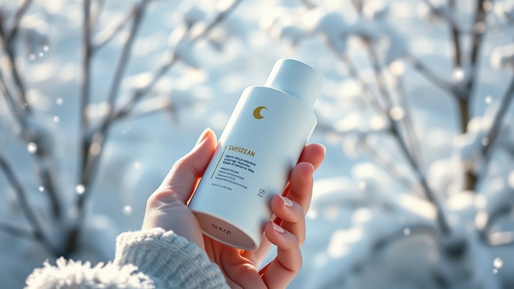 You should reapply sunscreen every two hours in cold weather, just like revitalizing a coat of paint before it chips. Even when the sun isn’t blazing, UV rays sneak through clouds and reflect off snow, making your skin vulnerable. I always keep a small bottle handy in my bag, so I can stay protected during outdoor walks or errands. Consistent reapplication keeps my skin safe, radiant, and shielded from winter’s sneaky rays.