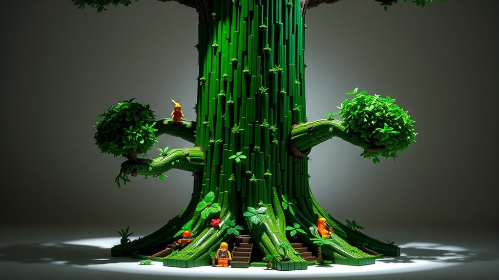 Lighting and effects can dramatically boost the visual impact of your Lego Zelda Great Deku Tree set, making it more eye-catching and immersive. Adding LED light kits with adjustable brightness and color options lets you customize the display to suit different environments and moods. Incorporating effects like glowing or internal illumination can make the model stand out in darker rooms, highlighting intricate details and creating a more vivid presentation. When choosing lighting, consider kits with clear installation instructions, as some require disassembly for wiring. High-quality components, such as copper wiring and low-voltage LEDs, ensure safety, durability, and consistent performance over time. Overall, well-chosen lighting and effects can transform your display into a captivating centerpiece that truly captures the magic of the Great Deku Tree.