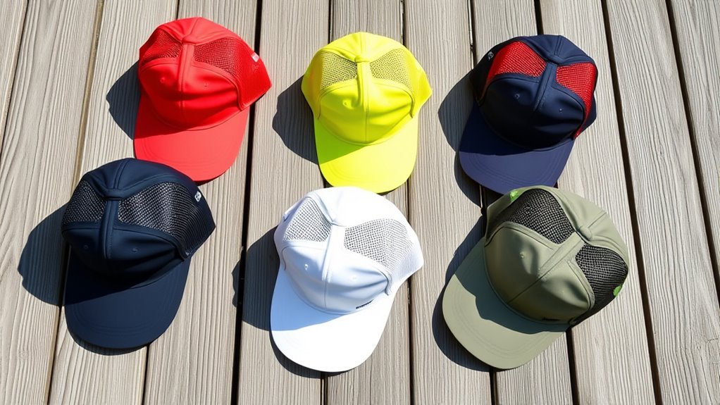 To stay comfortable during intense runs, I look for lightweight caps that effectively wick away sweat. Moisture-wicking fabrics like polyester or nylon blends draw sweat away from my skin, keeping my head dry and cool. Good caps also feature mesh panels or ventilation holes, which enhance airflow and help everything dry quickly. This moisture management prevents chafing, irritation, and discomfort during long or sweaty sessions. When a cap efficiently pulls moisture away, I notice a significant improvement in overall comfort and performance, especially on hot days. Staying dry not only feels better, but it also helps me stay focused and maintain my pace. So, I always prioritize moisture-wicking capabilities when choosing a lightweight running cap with UPF 50.