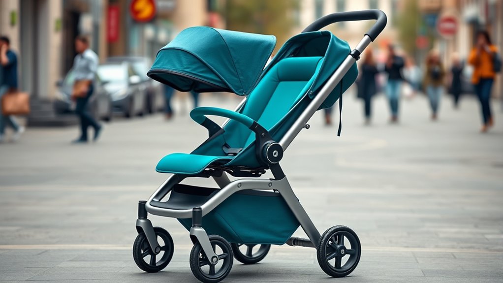 Choosing a lightweight stroller for travel means paying close attention to maneuverability features that make steering busy streets, crowded airports, and tight spaces much easier. A lightweight frame, usually under 15 pounds, helps you steer and control the stroller effortlessly. Swiveling front wheels boost responsiveness, allowing quick turns and smooth navigation through crowded areas. All-wheel suspension absorbs shocks, making rides smoother across different terrains. Compact folding mechanisms and small, silent wheels enhance portability, making it easy to store and carry the stroller. Additionally, adjustable handlebar heights ensure comfort for parents of varying sizes, while responsive steering improves overall control. Focusing on these features ensures that your stroller is easy to maneuver, giving you a stress-free travel experience with your little one.