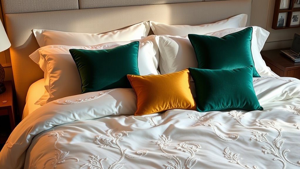 The thread count and weave of luxury bedding play a essential role in determining its softness, durability, and overall comfort. A higher thread count usually means a denser, softer fabric, with 300-800 being common for luxury sheets, but more isn’t always better—beyond 800, sheets can become heavy and less breathable. The weave type, like sateen or percale, also has a big impact; sateen feels silky and smooth, while percale offers a crisp, cool finish. Tightly woven fabrics are more durable and resist pilling, but looser weaves tend to be more breathable. Ultimately, understanding how these factors interact helps you choose sheets that feel luxurious and support better sleep, without sacrificing comfort or breathability.