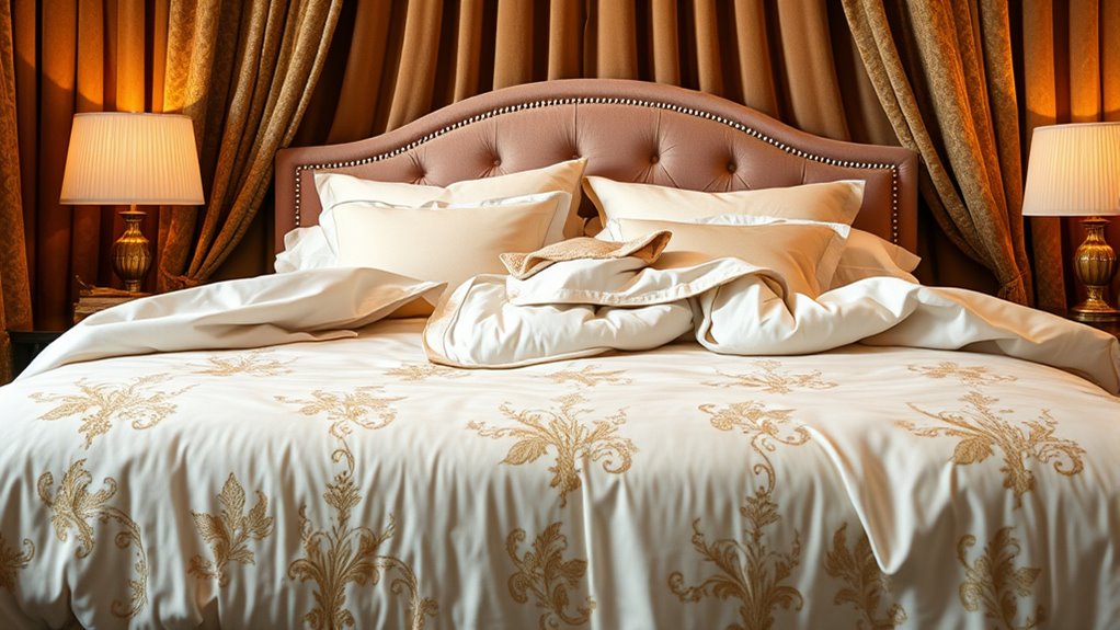 Choosing the right fabric for luxury bedding sets is essential because it directly affects how the bed feels and how comfortably you sleep. High-quality fabrics like Egyptian cotton, silk, or microfiber offer superior softness and durability, making your bed feel inviting and long-lasting. The fabric’s texture—silky, plush, or crisp—also plays a crucial role in comfort and can impact your sleep quality. Fabric weight, measured in GSM, indicates thickness and plushness; higher GSM typically means a more luxurious, heavier feel. Natural fibers like cotton and silk tend to become softer and more breathable over time, enhancing comfort, while synthetic fibers resist wrinkles and fading. The fabric’s finish, whether sateen, jacquard, or matte, adds to both the tactile experience and visual appeal of your bedding.