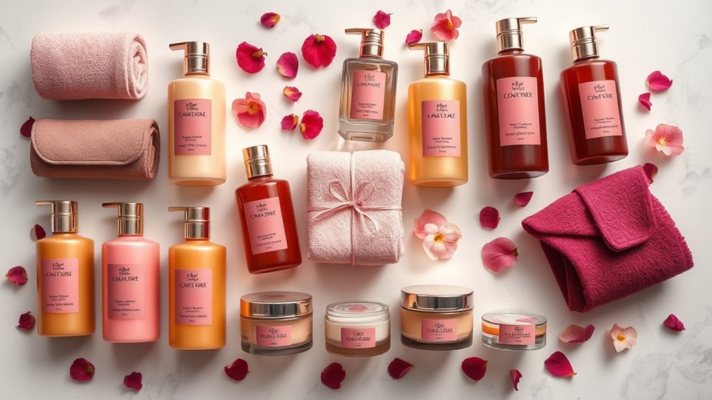 When selecting a body lotion set as a gift or for personal use, considering the recipient’s age, preferences, and skin type is essential to guarantee the product suits their needs. Think about the occasion—whether it’s a birthday, holiday, or anniversary—and choose a set that matches the formality and sentiment. Pay attention to scent preferences; some may love floral or vanilla aromas, while others prefer food-inspired or calming lavender scents. Ascertain the set offers skincare benefits tailored to specific concerns, like hydration for dry skin or soothing ingredients for sensitive skin. Additionally, select packaging that aligns with the recipient’s style and use, making the gift both beautiful and practical. This thoughtful approach ensures your choice feels personal and perfect.