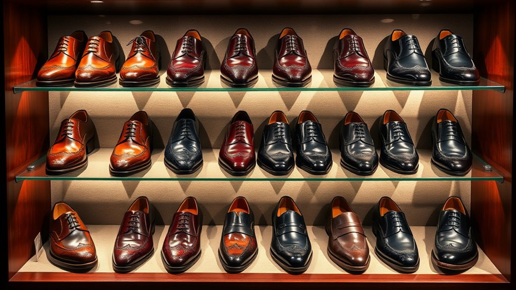 When it comes to luxury men’s dress shoes, construction and craftsmanship are paramount. I always look for detailed stitching methods like Blake Rapid Stitch or welt construction, as they enhance both durability and flexibility. Premium materials such as genuine Italian calfskin or textured leather not only elevate the shoe’s aesthetic but also guarantee long-lasting integrity. Handmade construction is another aspect I value, as it offers meticulous attention to detail, resulting in a refined finish and a better fit. The choice of sole materials—be it leather, rubber, or thermoplastic elastomers—affects comfort and grip. In the end, precise assembly techniques, including reinforced seams and secure closures, maintain the shoe’s structural integrity over time, making them a worthwhile investment.
