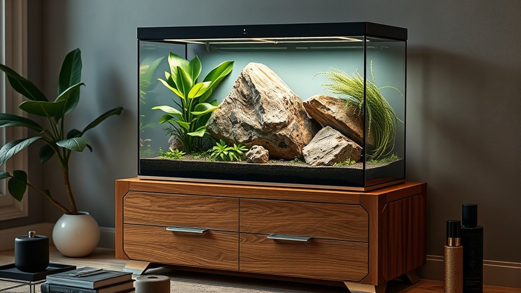 Choosing the perfect luxury reptile terrarium is like finding a hidden gem in a treasure chest—both stylish and practical. Whether you’re after sleek glass designs or spacious enclosures, these options blend form and function seamlessly. As I’ve discovered, the right setup can turn your reptile’s habitat into a regal palace, even if I do say so myself. So, take your time, and remember: in this modern age, your reptile deserves nothing less than the best.