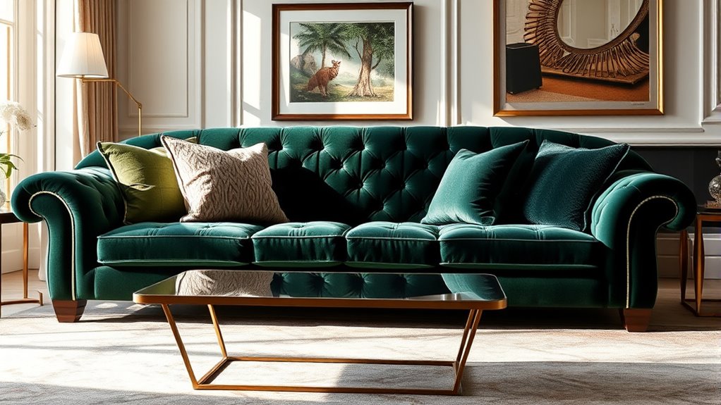 How can I guarantee my luxury sofa not only looks stunning but also stands the test of time? First, I choose a frame made from durable materials like kiln-dried hardwood or FSC-certified wood for lasting support. Removable, washable cushion covers in fabrics such as chenille or velvet make cleaning a breeze and keep my sofa fresh. I also look for upholstery that’s stain-resistant, pilling-proof, and fade-proof to enhance durability and minimize upkeep. Opting for modular designs with reinforced joints and high-density foam cushions helps prevent sagging. Ultimately, I commit to regular maintenance—vacuuming and promptly addressing spills extend my sofa’s lifespan, ensuring it remains both beautiful and functional for years to come.
