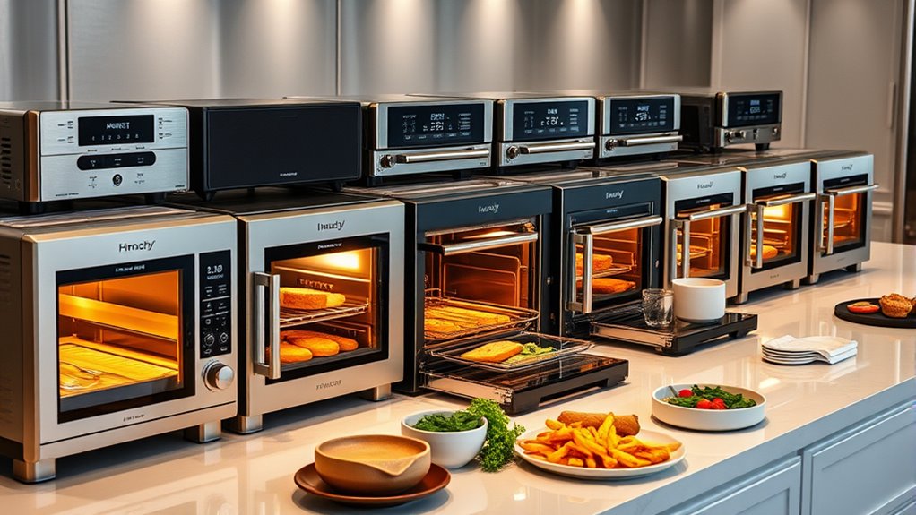 Precise temperature control is vital for achieving consistent cooking results in luxury toaster ovens with air fryer functions. These models typically offer adjustable ranges from 85°F to 450°F or higher, accommodating a variety of cooking techniques. Digital or PID controls provide accurate adjustments within ±5°F, ensuring reliable results. Some ovens feature adjustable temperature zones and independent top/bottom heating, allowing for zone-specific cooking—perfect for baking and roasting delicate dishes. High-end models also include exact digital readouts and preset programs that maintain precise temperatures throughout the cooking cycle. Reliable temperature control minimizes overcooking or undercooking, helping you achieve ideal textures and flavors every time. It’s a fundamental factor in elevating your home cooking experience with a luxury oven that delivers consistent, gourmet results.