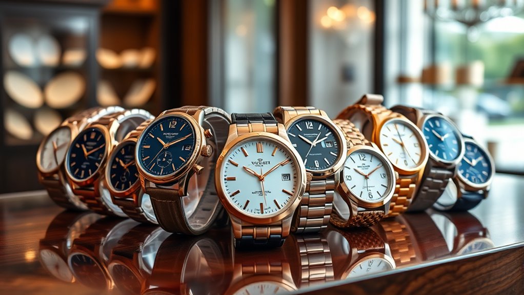 While exploring luxury watches, it’s essential to take into account the warranty and support offered by the brand. A thorough warranty provides coverage for manufacturing defects and repairs, giving me peace of mind with my investment. I find that the length and scope of the warranty, usually ranging from 1 to 5 years, greatly influence my sense of security. Reliable brands also offer dedicated customer service channels, including online support and authorized repair centers, which are indispensable for maintaining my watch’s performance and value. Additionally, I appreciate the option to purchase extended warranties or service plans for extra protection beyond the standard coverage. Overall, these factors play a critical role in my decision-making process.