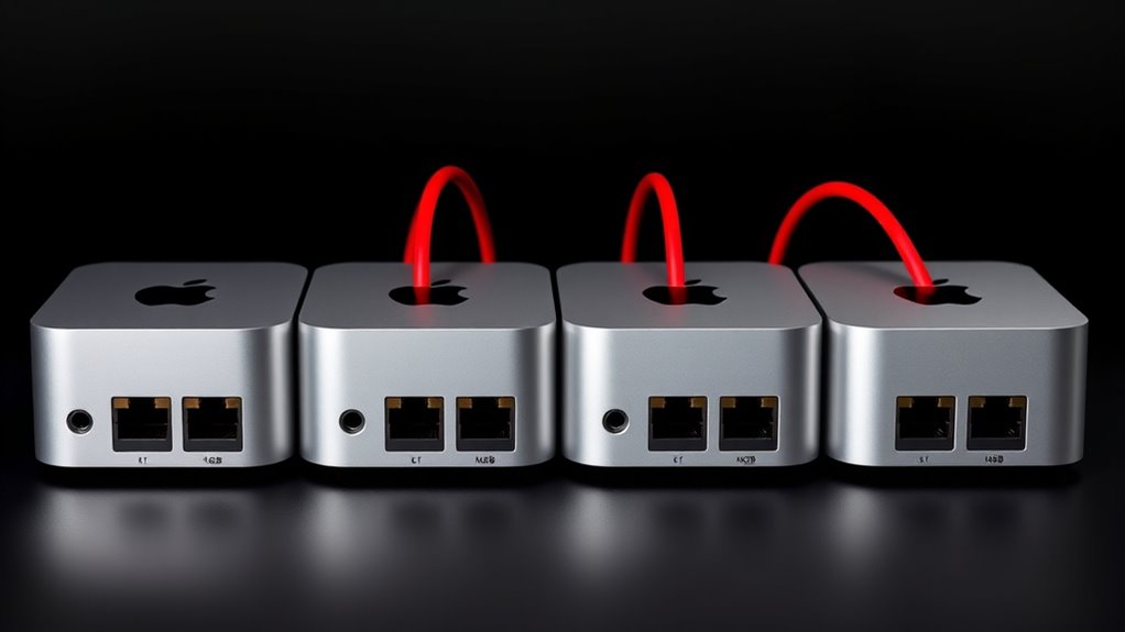 Choosing the right placement for your Mac Mini with 10Gb Ethernet is essential for maintaining ideal performance and longevity. Proper positioning ensures optimal airflow and cooling, which are vital during intensive network or processing tasks. Placing the device in a well-ventilated area, away from heat sources, helps prevent overheating. Despite its compact size, avoid cramped spaces that could block airflow. Elevating the Mac Mini slightly or using a cooling pad can improve heat dissipation and reduce fan noise during heavy use. Additionally, keep the device near your router or Ethernet port to minimize cable length and signal loss, guaranteeing reliable high-speed connections. Thoughtful placement not only enhances performance but also extends the lifespan of your Mac Mini with 10Gb Ethernet.