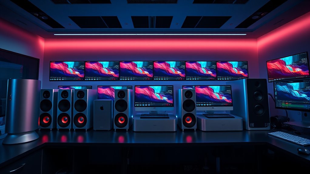 Imagine your editing workflow as a busy highway; the right Mac Pro configuration acts like a multi-lane expressway. I recommend models with high-core CPUs, ample RAM, and multiple GPU options to handle multi-camera editing smoothly. The more lanes you have—meaning cores and GPU power—the faster your footage flows through. So, opt for a setup with at least 24 cores, 128GB RAM, and dual GPUs to keep your multi-camera projects seamless.