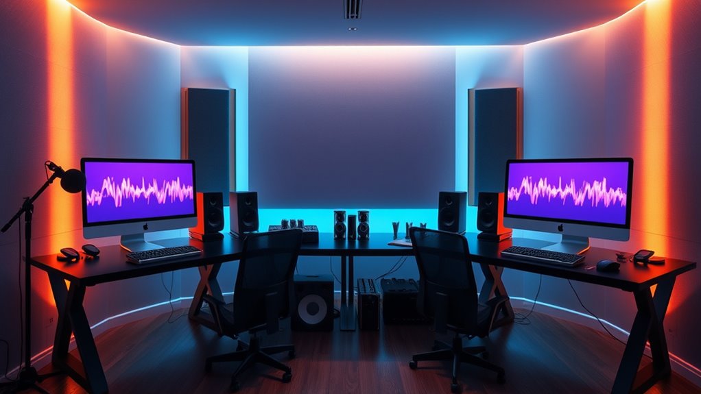Selecting a Mac Studio with adequate processing capability is crucial for smooth audio creation, especially when working with large projects or real-time mixing. High-performance CPUs, like those with 12 or more cores, significantly enhance rendering speeds and plugin processing, making complex workflows more efficient. Faster processors reduce editing, mastering, and exporting times, boosting productivity. They also guarantee your system handles resource-intensive DAWs and virtual instruments seamlessly, preventing lag or crashes. Upgrading to a more powerful CPU not only fulfills current needs but also future-proofs your setup against evolving software demands and larger projects. Fundamentally, investing in robust processing power keeps your audio production smooth, efficient, and prepared for whatever creative challenges lie ahead.