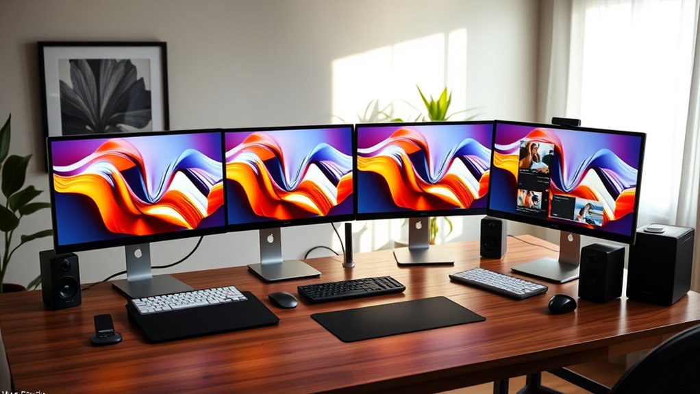 Have you ever considered how display compatibility impacts your photography workflow on a Mac Studio? It’s essential to ensure your chosen model supports the number and resolution of external displays you need, like 6K, 8K, or 4K screens, for precise editing. Check that it supports Thunderbolt 4, HDMI 2.1, and DisplayPort 2.1, enabling seamless connections to high-resolution monitors. Consider whether the Mac Studio can handle multiple displays simultaneously—up to three—so your workspace stays flexible and efficient. Also, verify that its hardware acceleration and media engines can process high-res photo and video formats such as ProRes and HDR content smoothly. Finally, confirm that the graphics capabilities meet your calibration and color accuracy needs essential for professional photography.
