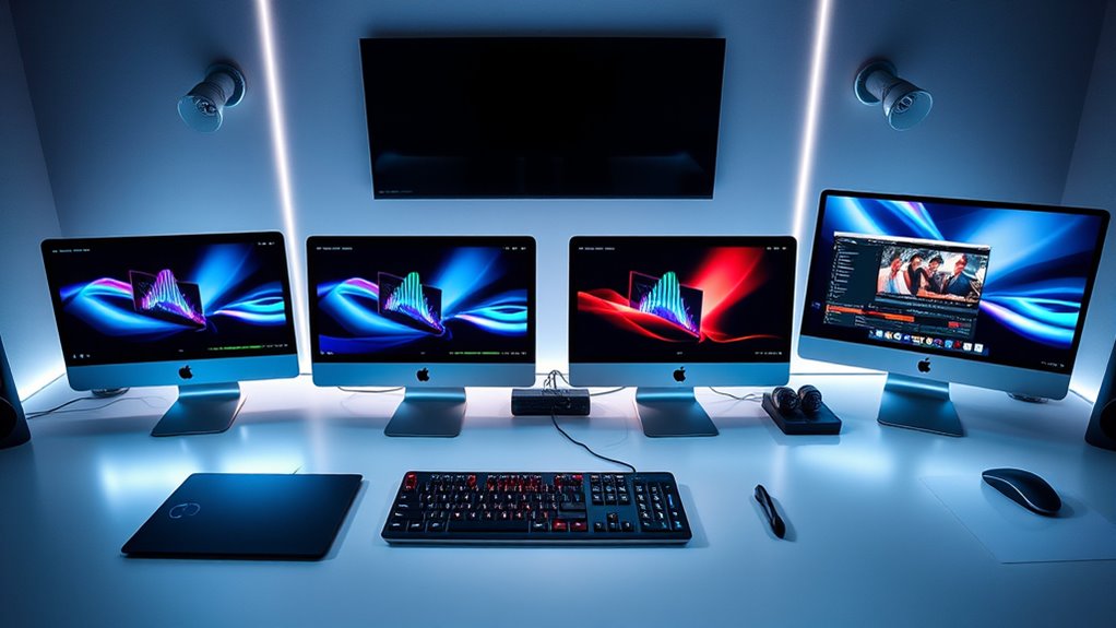 Understanding a Mac Studio’s connectivity options is key to building an efficient video editing setup. You’ll want enough Thunderbolt 4 or 5 ports to connect multiple high-speed external drives and peripherals, guaranteeing smooth data transfer. Check if the model supports multiple 6K or 8K displays at once, which is essential for multi-monitor editing workflows. An HDMI 2.1 port is also critical for high-resolution, high-refresh-rate external displays, providing detailed viewing options. Additionally, ensure there are enough USB-C or USB-A ports—adapters can help if needed—for audio interfaces, microphones, or card readers. Finally, consider Ethernet options, such as Gigabit or 10Gb Ethernet, for fast file transfers when working with large media files stored on networked storage. This connectivity versatility is vital for seamless editing performance.