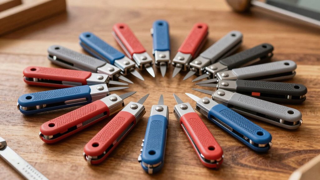 To choose the right grit level, I consider my knife’s condition and intended use. For dull or damaged blades, I start with a coarse grit to reshape the edge. For maintenance or fine-tuning, I switch to a medium or fine grit for smoother, sharper results. If I want a razor-sharp edge for precise tasks, I finish with an extra-fine grit. Matching grit to your knife’s needs guarantees ideal performance.