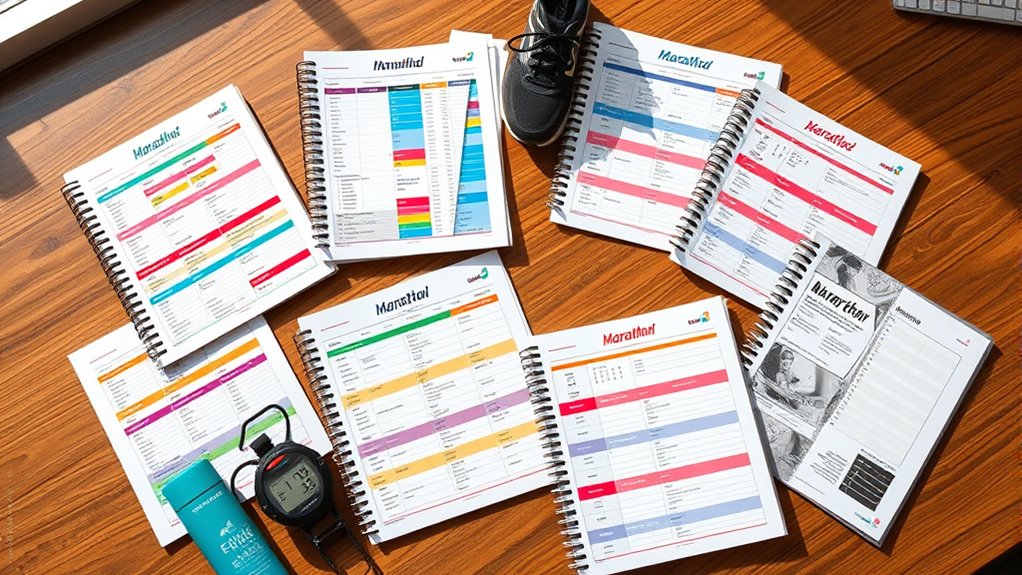 I’ve found eight top printable marathon training planners that help me stay organized, track progress, and stay motivated. These planners include structured schedules, goal-setting modules, and tips for injury prevention, nutrition, and tapering. They balance simplicity with detailed guidance, making them perfect whether you’re a beginner or experienced runner. If you want to discover which ones fit your style and boost your training, keep exploring—there’s plenty more to uncover.