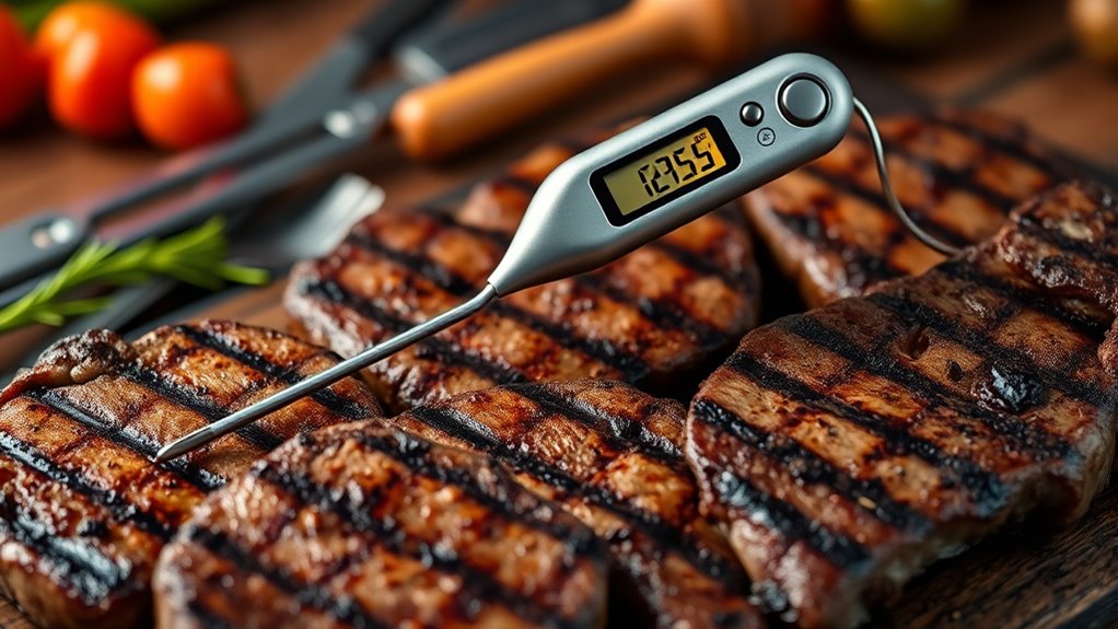Choosing a meat thermometer with the right temperature accuracy and range is vital for grilling success. I look for a device that offers at least ±1.8°F accuracy to guarantee precise doneness. The thermometer should cover a broad temperature range, typically from around 14°F to over 572°F, so it can handle everything from poultry to steaks and even oven environments. For most grilling tasks, an internal meat sensor that monitors up to 212°F is sufficient, but ambient sensors should measure higher temperatures—up to 527°F or more—to adapt to intense grill heat. Additionally, quick response times, within 3-4 seconds, are indispensable for real-time, accurate readings, helping me make confident cooking decisions without delay.