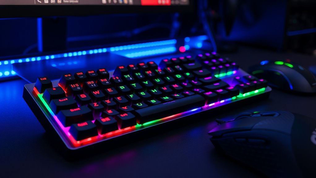 Key rollover and anti-ghosting are essential for gaming because they guarantee every keystroke registers accurately, even during intense moments. I find these features indispensable for fast-paced games where multiple keys are pressed simultaneously. Without them, I risk input errors that can cost me the game. So, I always look for keyboards with high key rollover and anti-ghosting to keep my gameplay smooth and responsive.