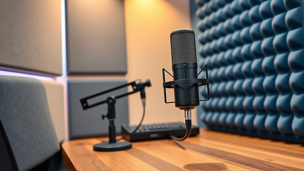 Choosing the right microphone type and pattern is essential for achieving clear, focused sound in your podcast. Cardioid microphones are popular because they pick up sound primarily from the front, which helps minimize background noise. Dynamic microphones are durable and excel at rejecting ambient noise, making them perfect for noisy environments. Condenser microphones offer higher sensitivity and a broader frequency response, ideal for studio-quality recordings, but they require a sound-treated space. Omnidirectional microphones capture sound from all directions, suitable for group recordings but more prone to background noise. The microphone pattern notably impacts how well your voice is isolated and how much environmental sound is picked up. Selecting the appropriate type and pattern depends on your recording environment and specific podcasting needs.