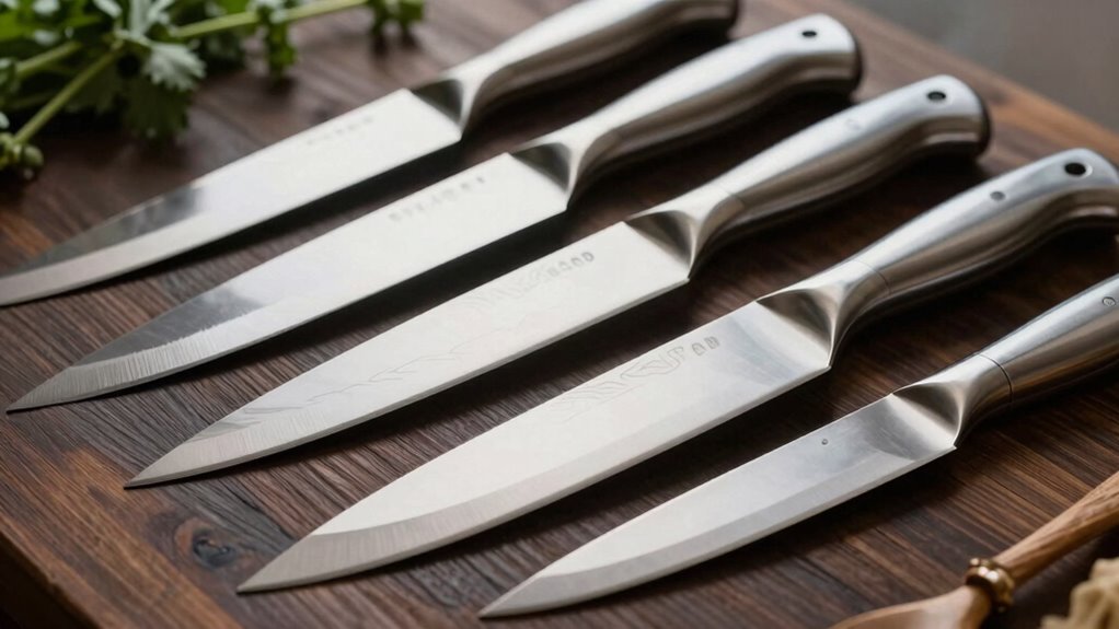 Blade thickness gently guides my hand’s dance with ingredients. Thinner blades glide through vegetables with whisper-like ease, offering razor-sharp precision and effortless cuts. Thicker blades provide stability, making slicing feel more grounded and controlled, especially with tougher produce. I find that selecting the right thickness depends on the task—delicate julienning or sturdy chopping—and it truly transforms the cooking experience, blending ease and finesse seamlessly.