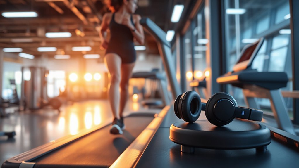 To guarantee you get the most out of your treadmill workouts, it’s crucial to prioritize sound quality clarity in your noise cancelling headphones. High-quality headphones use advanced active noise cancelling (ANC) technology to effectively block out ambient noise, ensuring you hear your music or calls clearly. Larger drivers, like 40mm dynamic units, deliver richer bass and more detailed mid and high frequencies, enhancing overall sound clarity. Headphones with noise reduction microphones improve call quality and voice command responsiveness, even in noisy gyms. Additionally, customizable sound profiles and well-tuned equalizer settings help emphasize vocals and core instruments, making your listening experience more precise. Finally, sealed or in-ear designs create a secure fit that minimizes external noise leakage, further sharpening sound clarity and keeping distractions at bay.