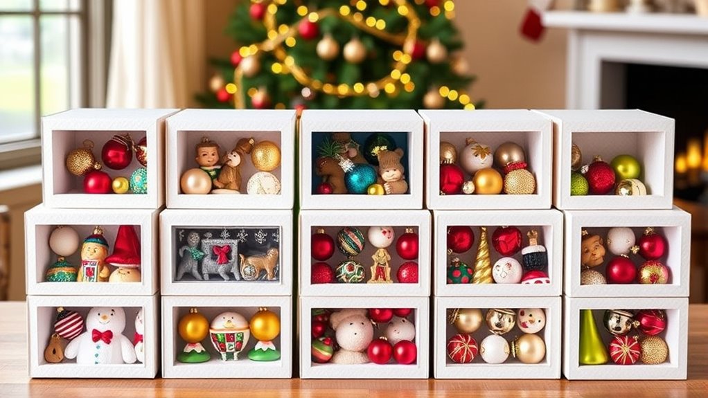 Think of these storage boxes as tailor-made wardrobes for your ornaments. Yes, many models feature adjustable dividers, so you can customize the compartments for different ornament sizes. I love how flexible they are—making it easy to fit everything from tiny baubles to larger keepsakes. This adaptability guarantees each decoration is snug and secure, preventing any accidental damage during storage or transit.