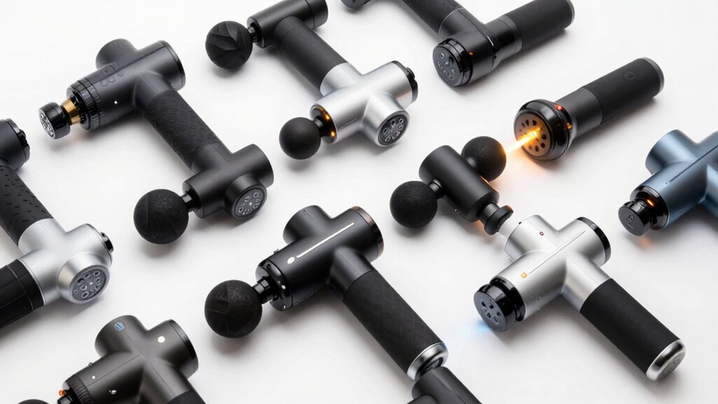 Ever wondered how much power and battery life you really need in a percussion massage gun with heated heads? The answer depends on your therapy needs. A higher wattage motor delivers more power, ensuring effective percussion, especially for deep tissue work. For longer sessions, look for models with a battery capacity of at least 2500mAh, which can last between 2 to 4 hours on a single charge. Fast-charging features, like USB-C PD, minimize downtime and keep you ready to go. A battery indicator is also helpful, so you can monitor remaining power and avoid interruptions. Balancing power and battery life ensures you get consistent performance without frequent recharging, making your massage sessions more efficient and enjoyable.