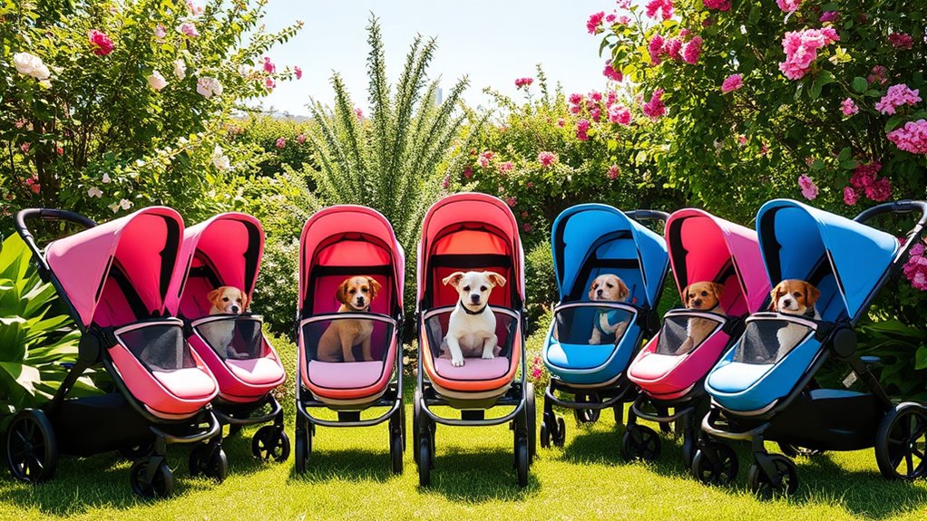 While weight capacity is important, safety features are just as vital in selecting the right stroller for my small dog. Secure harnesses and straps are essential to keep my furry friend safe and prevent any daring escapes during our outings. I also look for mesh panels and breathable windows that guarantee proper ventilation, reducing the risk of overheating. A reliable brake system is a must, as it stabilizes the stroller when we’re stationary, especially on uneven terrain. Zipper closures and secure enclosures give me peace of mind in crowded areas. Ultimately, I appreciate reflective trims and bright colors, which enhance visibility and keep us safe during low-light walks. Prioritizing safety means more enjoyable adventures together!