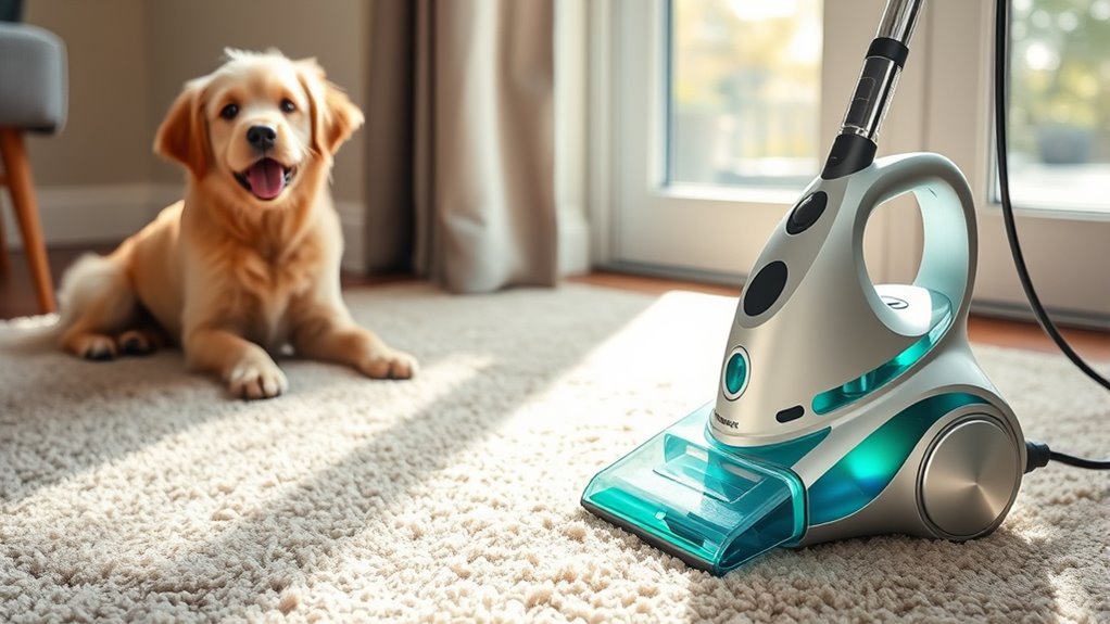 When it comes to cleaning pet messes, the ease of maintaining your carpet cleaner can make a big difference in how often and effectively you use it. Look for models with removable, washable tanks and components—these simplify maintenance and keep messes contained. Machines with self-cleaning tools or hose rinse features help uphold hygiene and prevent odors after each use. Clear, accessible fill and empty ports make refilling and emptying quick and spill-free. Lightweight and ergonomic designs reduce fatigue, allowing effortless handling and maneuvering during cleaning sessions. Additionally, simple, intuitive controls ensure you can operate the cleaner effectively without needing technical skills. Prioritizing ease of cleaning means less hassle and more consistent, thorough results, making your pet-related cleaning tasks much more manageable.