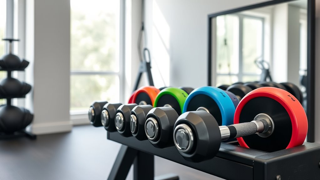Choosing the right dumbbell set hinges on how comfortably and securely you can grip the handles, especially during intense or prolonged workouts. Ergonomic, non-slip handles with textured grips improve control and safety, even when hands sweat. Handle diameter and length influence comfort, with larger diameters offering a more secure grip for heavier lifts. Soft rubber or foam grips reduce wrist fatigue and absorb sweat, making extended sessions more comfortable. A well-designed grip minimizes slipping and wobbling, providing stability when lifting heavier weights. Handles with deep grooves or knurled surfaces increase friction, boosting control and reducing accidental slips. Prioritizing grip comfort and control ensures safer, more effective workouts, helping you maintain proper form and push your limits confidently.