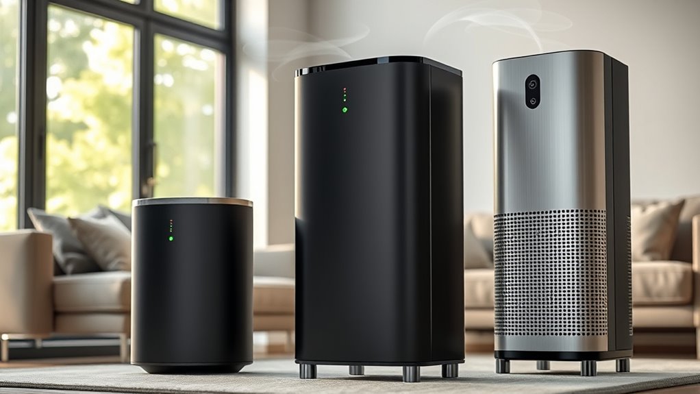 Yes, there are quiet models perfect for peaceful, undisturbed sleep. I’ve found that many premium purifiers feature whisper-quiet fans and sleep modes that dim lights, creating calm conditions for night-time use. These models efficiently filter allergens and pollutants without disturbing your rest. So, if you’re seeking serenity and clean air, I suggest exploring those specifically designed for silent, soothing operation during your sleep hours.