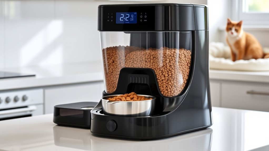 Automatic feeders prevent food spoilage and mold growth by keeping food sealed and fresh. I make sure to choose models with airtight lids and consider ones with refrigerated compartments for wet food. Regular cleaning is key, so I clean the compartments often. Some feeders have built-in desiccants or moisture control features that help keep the food dry and fresh longer, reducing the risk of mold.