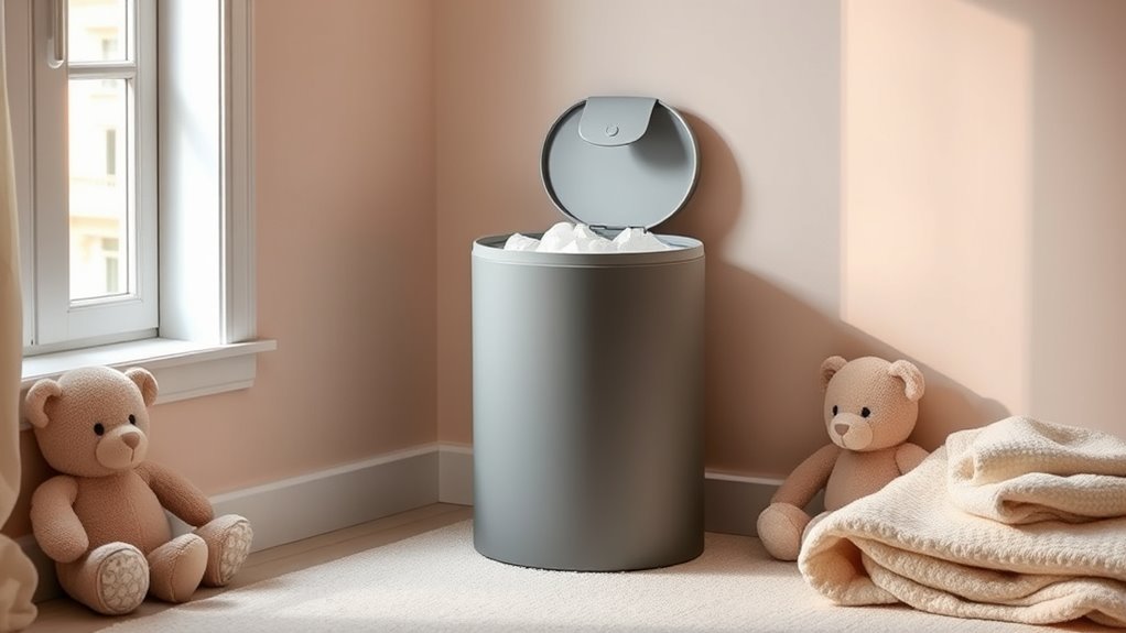 Premium diaper pails prevent odor leakage effectively by using airtight seals that lock in smells. I love how their innovative filters, often charcoal-based, trap odors before they escape. The design also minimizes air exchange, keeping smells contained. Plus, their sturdy construction and secure lids make sure odors stay inside, so my nursery stays fresh and odor-free. It’s a simple yet effective way to manage diaper odors effortlessly.
