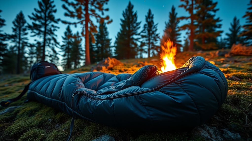 Choosing the right insulation material plays a key role in how well a backpacking sleeping bag performs in different conditions. High-quality options like RDS-certified down and Cirroloft synthetic fill offer excellent warmth-to-weight ratios, making sure you stay warm without adding bulk. The durability and loft retention depend on fiber density, fill power, and manufacturing techniques, which directly influence insulation efficiency. Natural insulations, such as down, provide exceptional warmth and compressibility but need careful moisture management. Synthetic insulations perform better in damp conditions and are more resistant to moisture. The insulation’s thermal efficiency is indicated by temperature ratings and fill power—higher fill power means better loft and insulation quality. Selecting the right material guarantees maximum performance, reduces cold spots, and keeps you comfortable during your outdoor adventures.