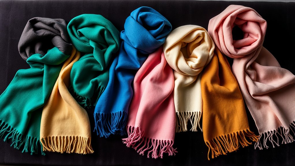 Choosing the right cashmere scarf involves more than just quality; color versatility plays a crucial role in ensuring your investment pays off across different outfits and seasons. Versatile color options like neutral shades, deep reds, and pastels make pairing effortless and adaptable. Classic colors such as black, navy, and beige are timeless, suitable for both formal and casual wear, making them essential staples. Bright hues like pinks and reds add a lively pop of color and serve as statement pieces. Light colors like ivory or blush pink are perfect for layering, creating soft, elegant looks. Multi-colored or patterned scarves add variety and can complement specific wardrobe themes or seasonal trends, giving you flexibility to style your outfits creatively throughout the year.
