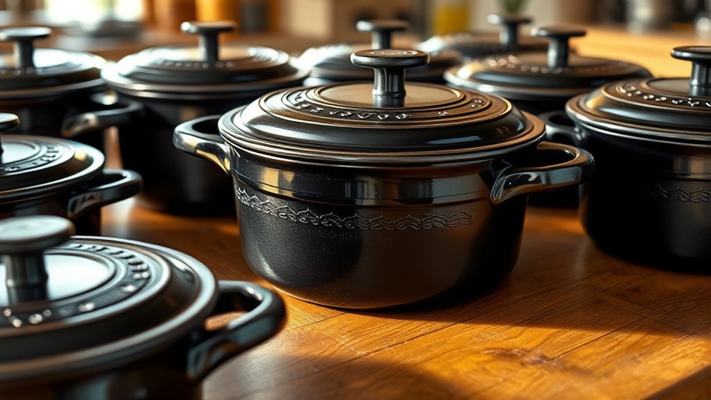 High-quality cast iron Dutch ovens excel not only in durability but also in how efficiently they distribute heat during cooking. Thick, high-quality walls help spread heat evenly across the entire surface, preventing hot spots and ensuring consistent results. A well-designed lid with internal ridges or condensation channels promotes uniform moisture circulation, enhancing heat retention. Some models incorporate multi-layer enameled coatings or specific casting techniques to improve heat conductivity further. The weight, typically between 12 to 22 pounds, also plays a role by stabilizing heat transfer during long cooking sessions. Additionally, a properly seasoned or pre-treated surface creates a smooth, non-stick layer that distributes heat more evenly. All these factors work together to deliver ideal heat distribution, making your dishes turn out just right every time.