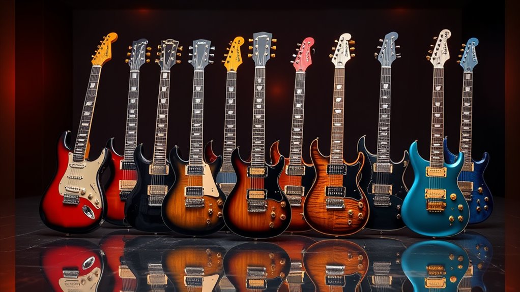 If you’re dreaming of the best premium electric guitars, I’ve found some exceptional options that truly inspire musicians. From iconic models like Fender Stratocasters to versatile Kramer and Gibson classics, these guitars deliver legendary tone, superior craftsmanship, and outstanding playability. Whether you want a vintage vibe or modern edge, these top-tier instruments are crafted for excellence. Stick around, and I’ll share more details about each one to help you find your perfect match.