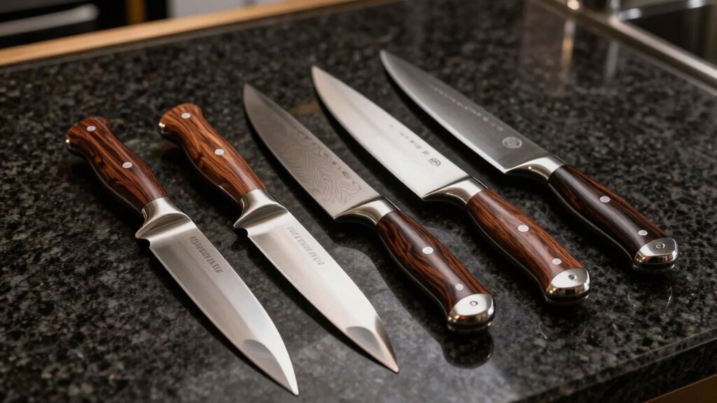 The artistry and craftsmanship behind premium knives over $500 are what truly set them apart, transforming a functional tool into a work of art. I’m captivated by the intricate Damascus steel patterns, which showcase meticulous craftsmanship and artistic flair. The use of premium materials like stabilized wood, exotic resins, and custom handles not only adds to their beauty but also enhances durability. Hand-forged by master artisans, each knife carries unique details that elevate its visual and tactile quality. Fine finishes, decorative bolsters, and precise bevels contribute to their elegance and luxury. These knives emphasize balanced proportions and seamless welding, reflecting superior craftsmanship and aesthetic harmony. Choosing a knife with exceptional artistry ensures I not only get a precise tool but also a timeless piece of craftsmanship.