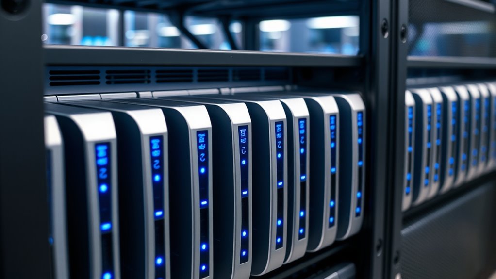 NAS scalability directly impacts my long-term storage needs by allowing me to expand my system as my data grows. It guarantees I can add more drives or upgrade components without disrupting operations, saving me time and money. This flexibility helps me stay ahead of increasing data demands, ensuring reliable performance and avoiding the need for a complete overhaul. Scalability keeps my storage solutions future-proof and adaptable to my evolving needs.