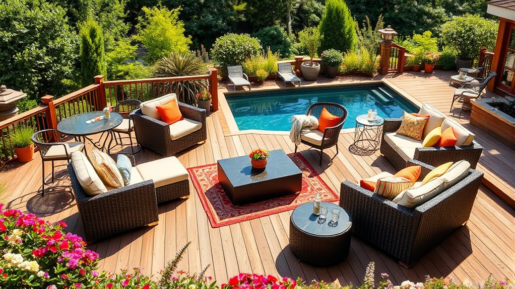 Choosing premium patio furniture involves more than just aesthetics; it’s essential to take into account material quality and durability. I’ve found that high-quality materials like PE rattan, aluminum, or powder-coated steel can withstand harsh weather, ensuring your furniture lasts. Look for durable cushions made from waterproof, fade-resistant fabrics with removable covers, which make maintenance a breeze. Frames crafted from reinforced wicker or metal prevent cracking and rust, giving you peace of mind. If you prefer wood, go for properly treated options like FSC-certified acacia or teak—they can endure outdoor conditions while looking great. Finally, investing in weather-resistant finishes and corrosion-proof hardware can save you from frequent replacements, making your patio furniture a smart long-term investment.